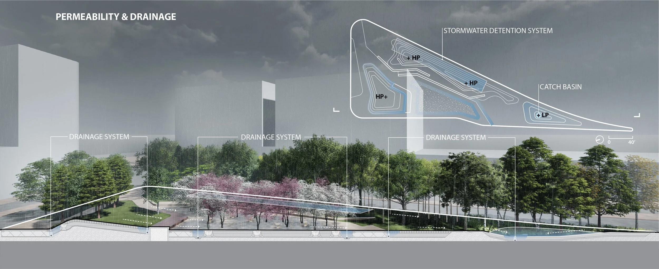 The very south end of the site- where triangle comes to a vary sharp and dramatic point, the earth is excavated to collect the site’s stormwater (a kind of green infrastructure stormwater “sponge”) and is overplanted as a lowland forest of Dawn Redwoods and a variety of birch species with an understory of ferns and witch-hazel. This feature even twenty years ago would have been non-existent, as conventional engineering techniques would have relied on pipes and infrastructure to flush the water away; here, instead, we deliberately retain the water on site into order to create ecological diversity and an environmentally healthy space.