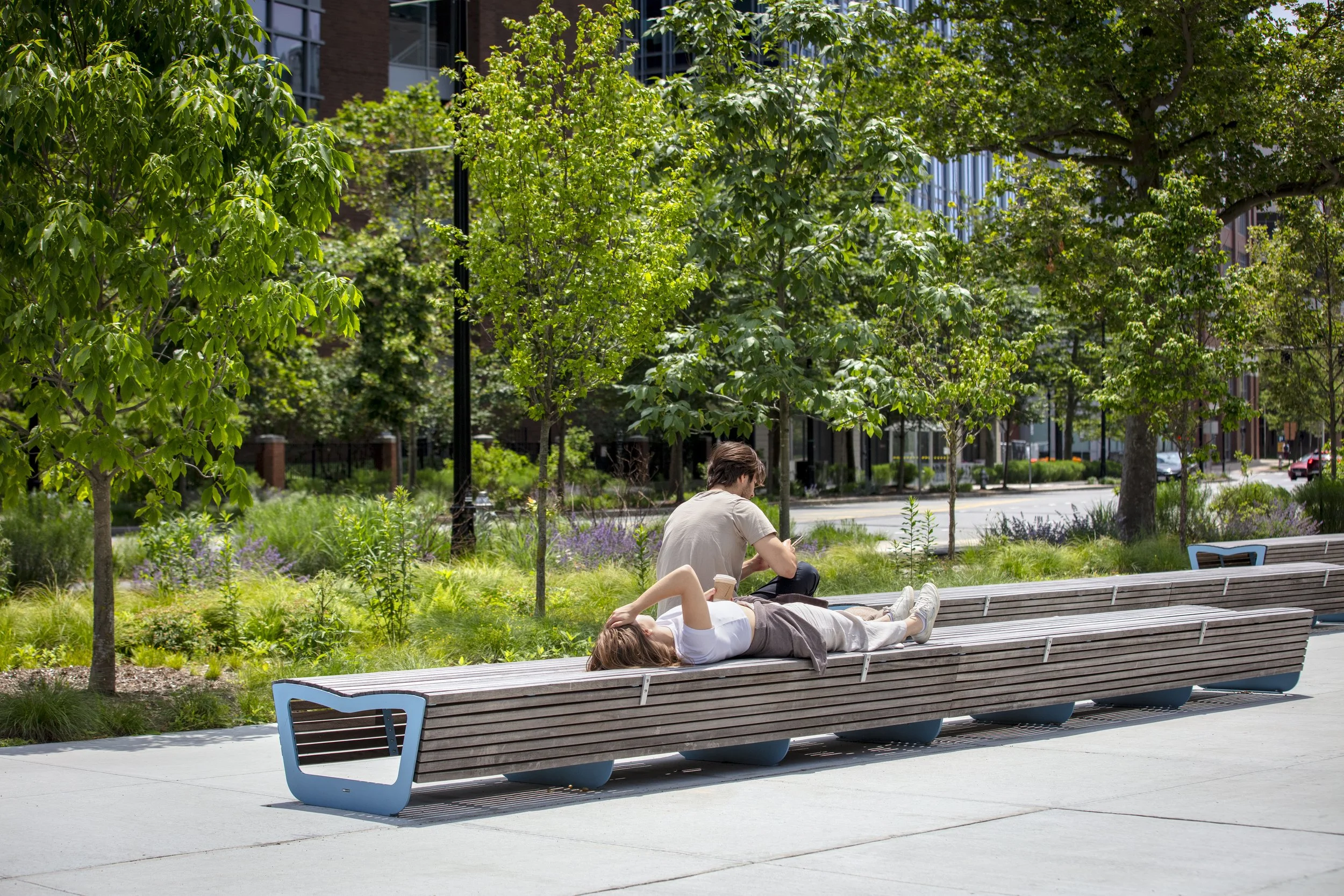 Customized MMCITE benches integrated into the site, including backed, backless, and double sided benches, providing a variety of seating options along with the painted logs
