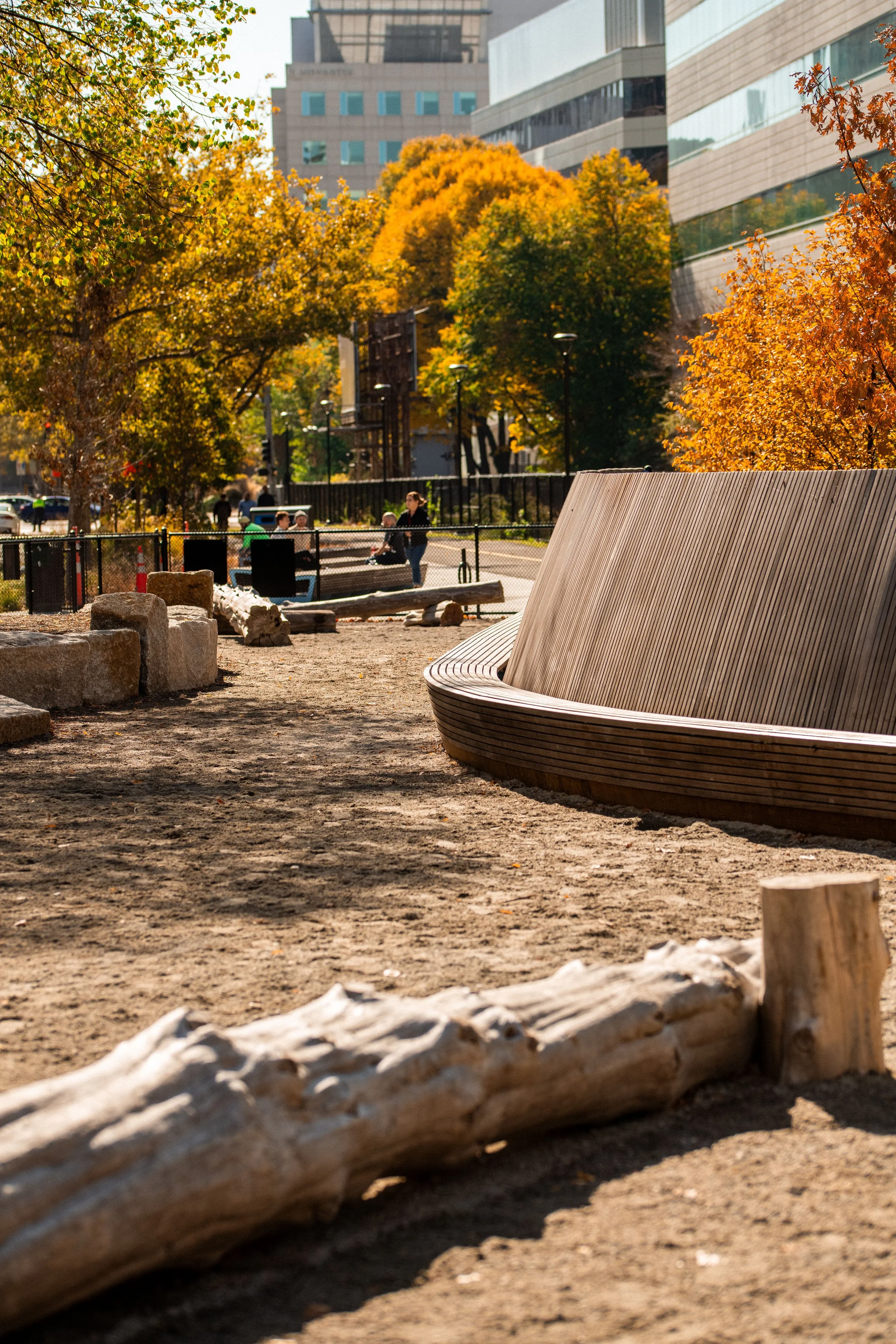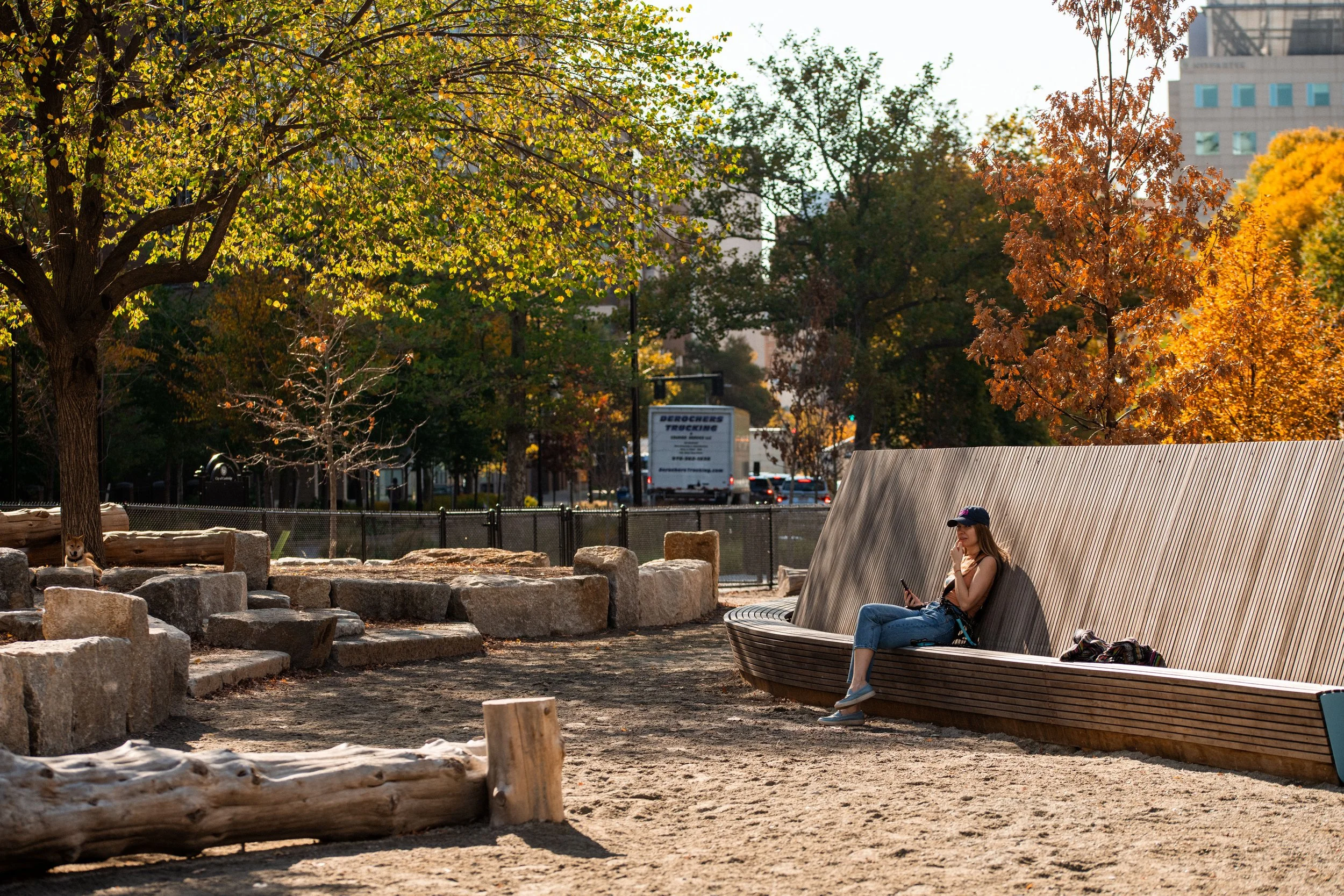 At the surface, Binney Park connects nearby workers, residents, and dog owners through the blending of a playful fenced in dog area and intimate gathering spaces with a variety of enclosure, creating a more cohesive space and increased opportunity for social connections between people and dogs (whether one is a dog owner or not), and between people and people. At each of the dog park entrances, social gathering spaces are framed around a variety of customized wood benches, including high-backed benches for a greater of enclosure and screening of roadway traffic, and a custom wood terrace that sits below the mature cottonwood tree. Inside the dog park, four mature trees cast shade on the synthetic turf and painted logs for dogs to scramble or owners to rest. The synthetic turf provides ease of maintenance for the City, while additionally allowing for quick percolation of stormwater.