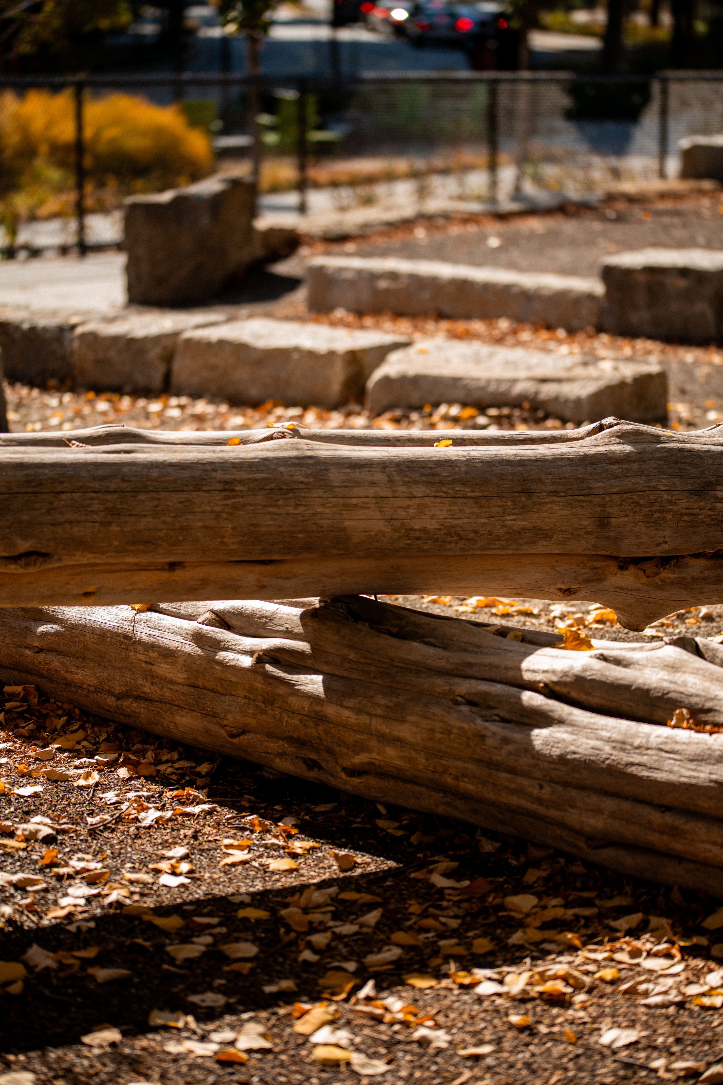 Recycled logs provide playful structure for dogs to run up and climb or for dog owners to sit on
